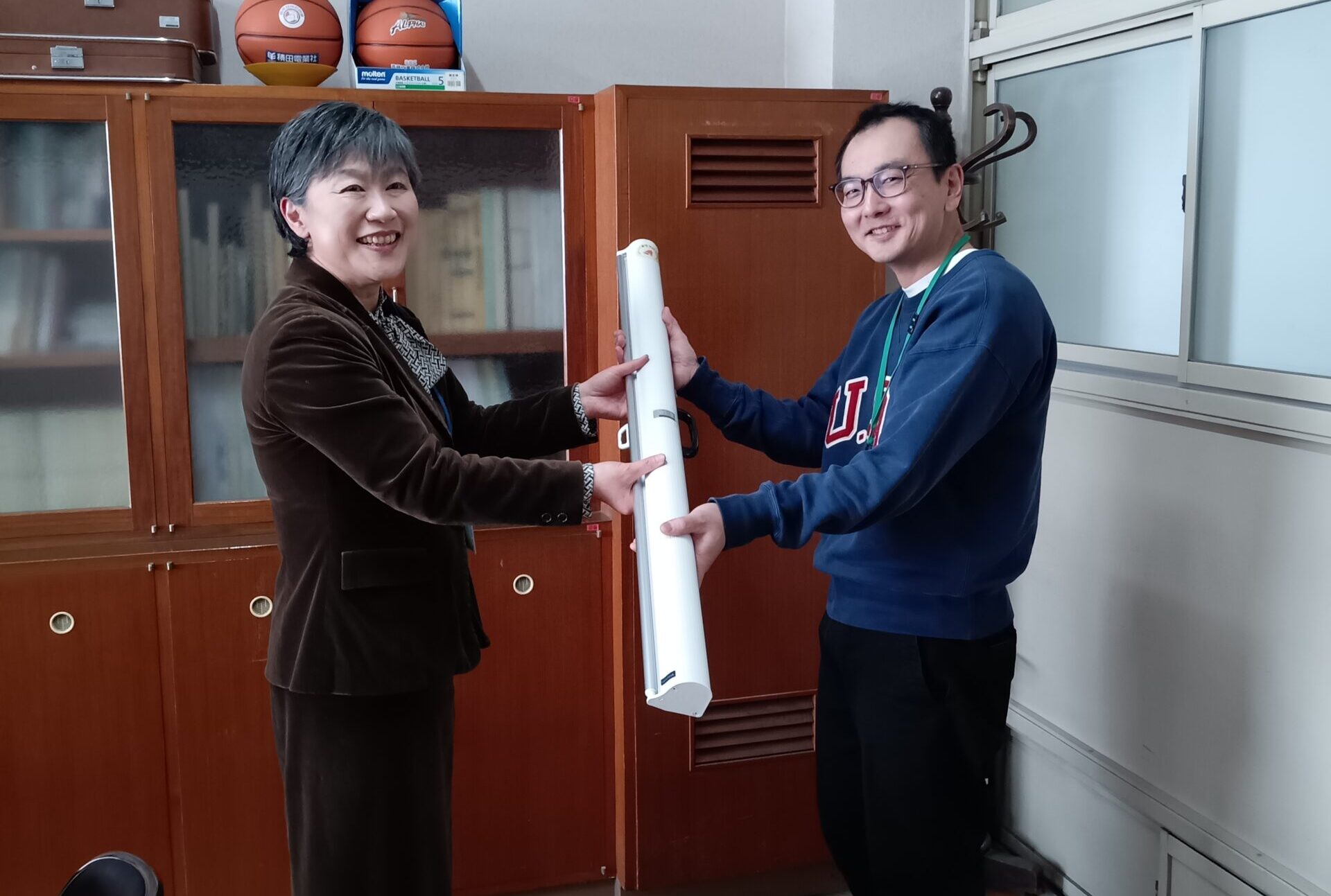 このたび、集まったベルマークの点数を活用し、『ケース一体型モバイルマグネットスクリーン』を3本贈呈いたしました。