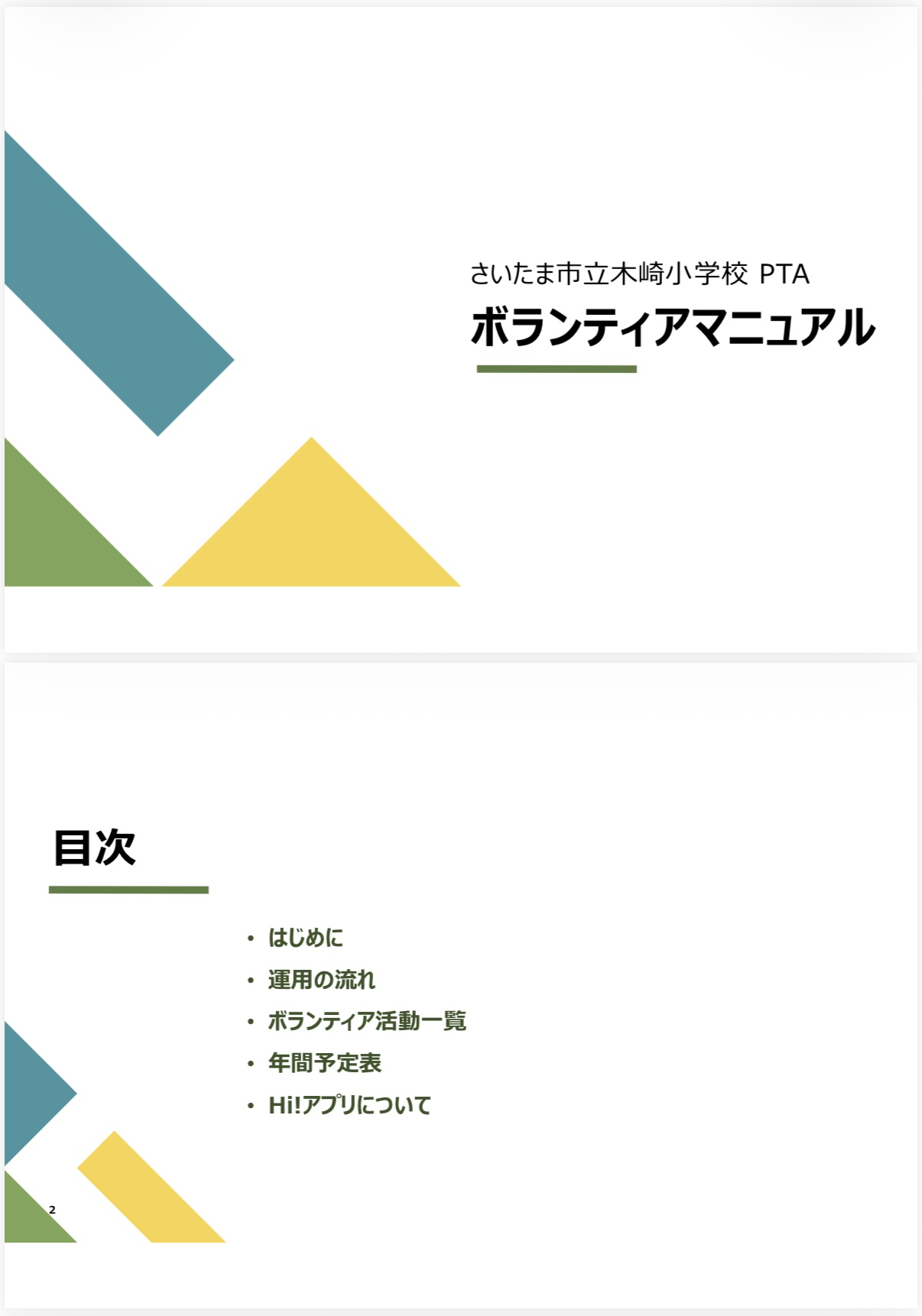 ホームお知らせ01_本部からのお知らせ 木崎小PTAボランティアマニュアル 2026年4月13日 令和7年度より、木崎小PTAはボランティア制へ移行しました! 各ボランティアの活動内容やおおまかなスケジュールをご案内いたします。 詳細は下の表紙をタップ頂き、ボランティアマニュアルをご覧ください。 「できる時に、できる人が、できることを!」 表紙をタップ☟