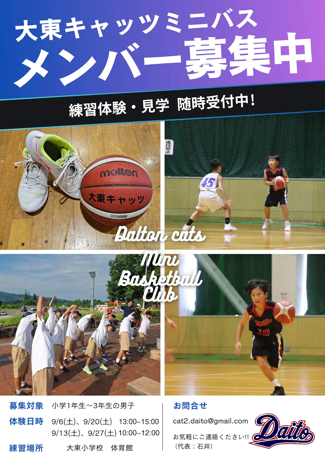 こんにちは!ミニバスケットチームの大東キャッツです。大東小学校体育館で毎週水・土・日に活動しています。体験・見学随時受付中です!お気軽にお問い合わせください。